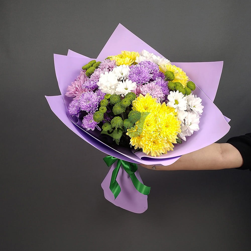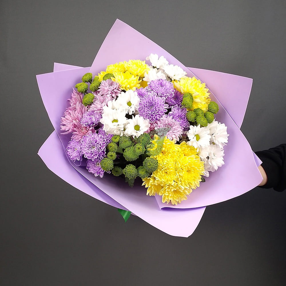 Состав и характеристики букета разноцветной хризантемы "Пёстрый":