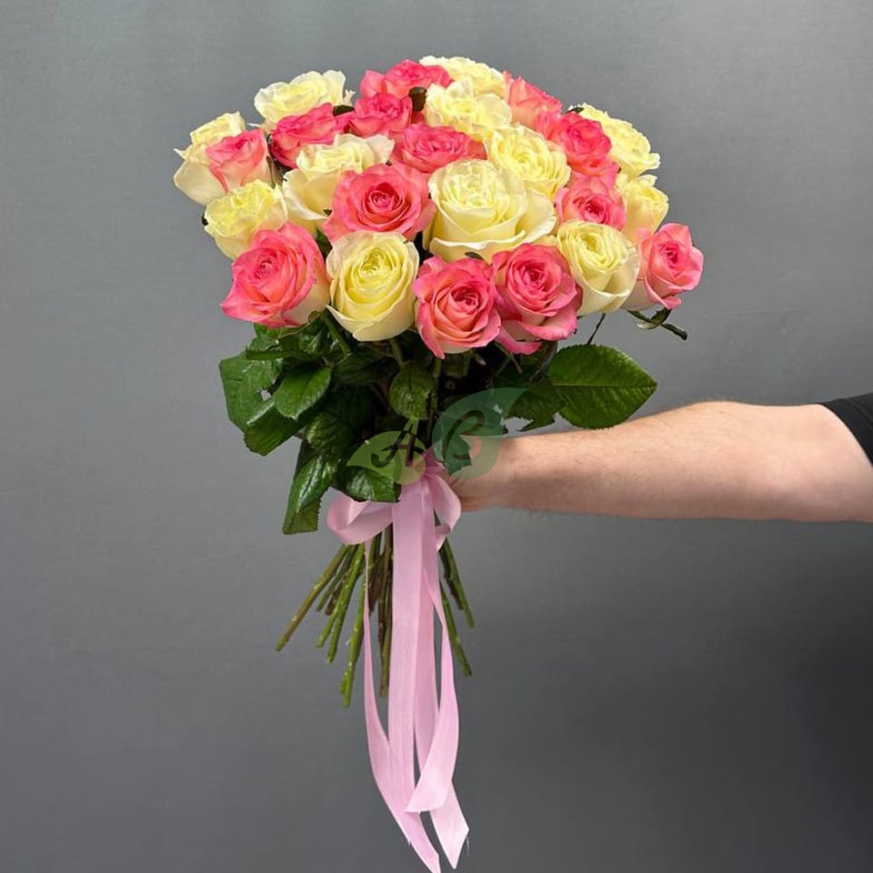 25 роз белого и розового цвета – лучший букет, достойный самой красивой невесты. Роскошь этих цветов можно дополнить сладким подарком или набором косметики и заказать доставку прямо в руки. Тогда его можно подарить не только на свадьбу, но и на 8 марта или любой другой праздник.